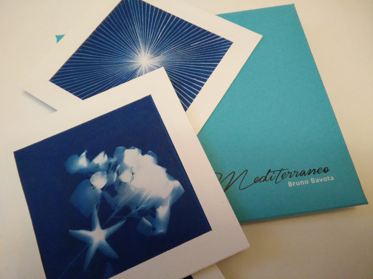 Silk-screen printing envelope, 3 handmade cyanotype images in a frames, muline, 50 handnumbered copies